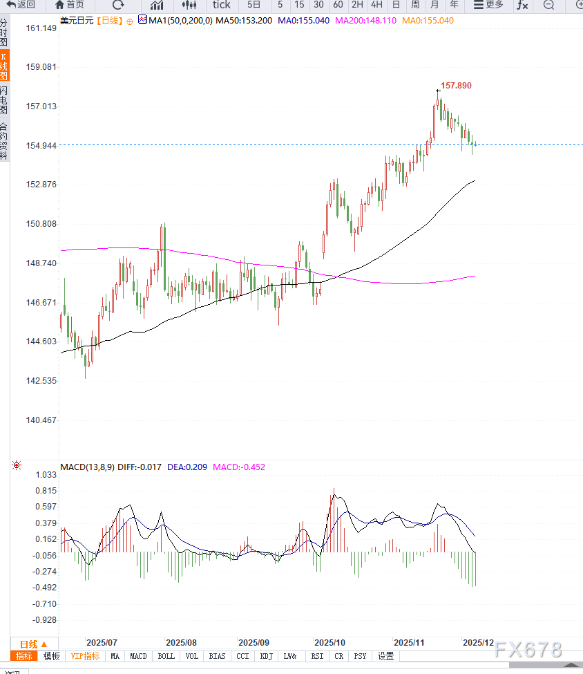 若跌破154.50一带的前低,报价可能进一步加速下探至154.00整数关口。